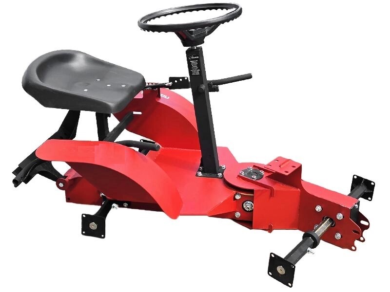 Рама выполнена из листового металла толщиной 4 мм с усиленными узлами на конических подшипниках. Крутящий момент передается через две усиленные цепи, а поворот осуществляется рулевым редуктором с тягой на шаровых шарнирах.