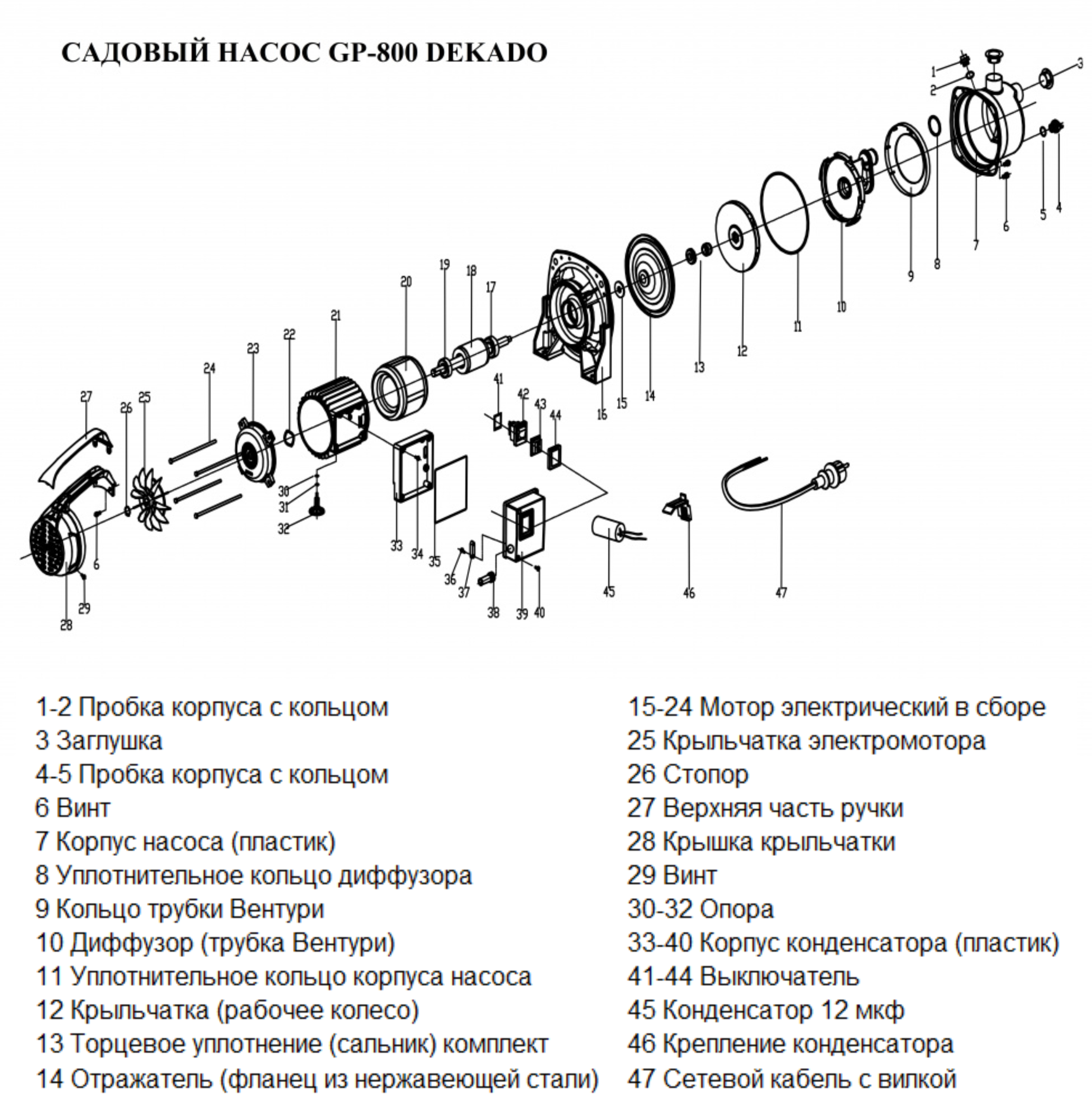Поверхностный (садовый) насос GP-800 DEKADO при эксплуатации не погружается в перекачиваемую жидкую среду – его располагают на поверхности земли, в непосредственной близости от источника водоснабжения. Чаще всего насосные устройства данного типа используют для работ с дождевой, пресной водопроводной, а также содержащей хлор водой из бассейна, откачивания воды из колодезных источников, так как глубина, с которой они могут эффективно откачивать жидкую среду, составляет не более 7 метров. Насос садовый GP-800 DEKADO предназначен для осушения затопленных мест, перекачки, забора воды из колодцев и скважин, повышения давления в системах водоснабжения. Поверхностным насосом GP-800 DEKADO можно перекачивать только воду не имеющую механических примесей. Насос предназначен только для бытового использования.