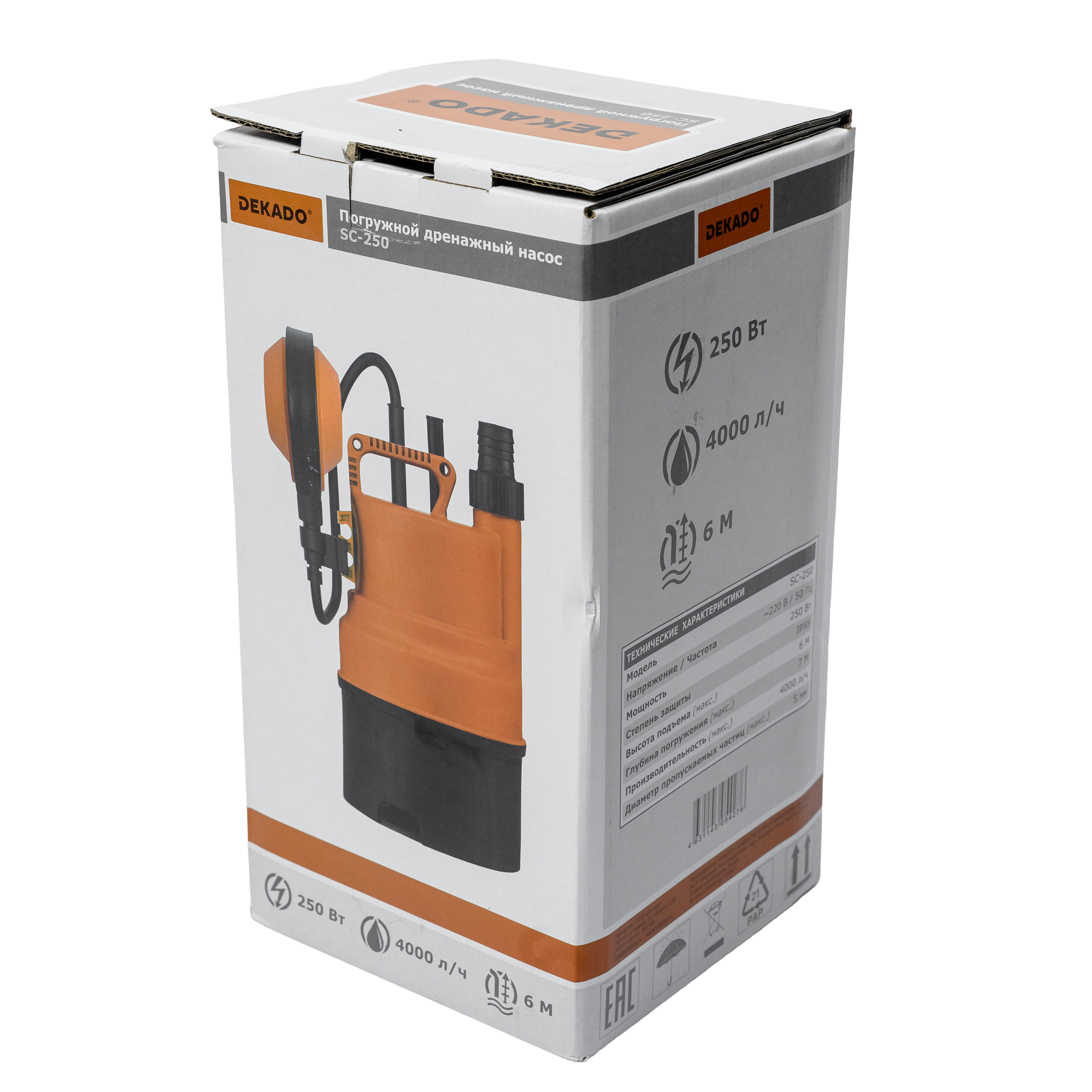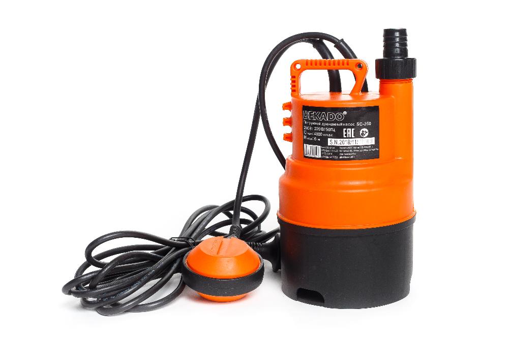 Насос погружной SС-250 DEKADO имеет корпус из пластика. Дренажный насос снабжен поплавковым выключателем, автоматически отключающим насос при отсутствии жидкости и автоматически включающим его при наличии жидкости для перекачивания. В случае перегрева или перегрузки, встроенная термозащита автоматически выключает насос и после остывания мотора автоматически его включает.