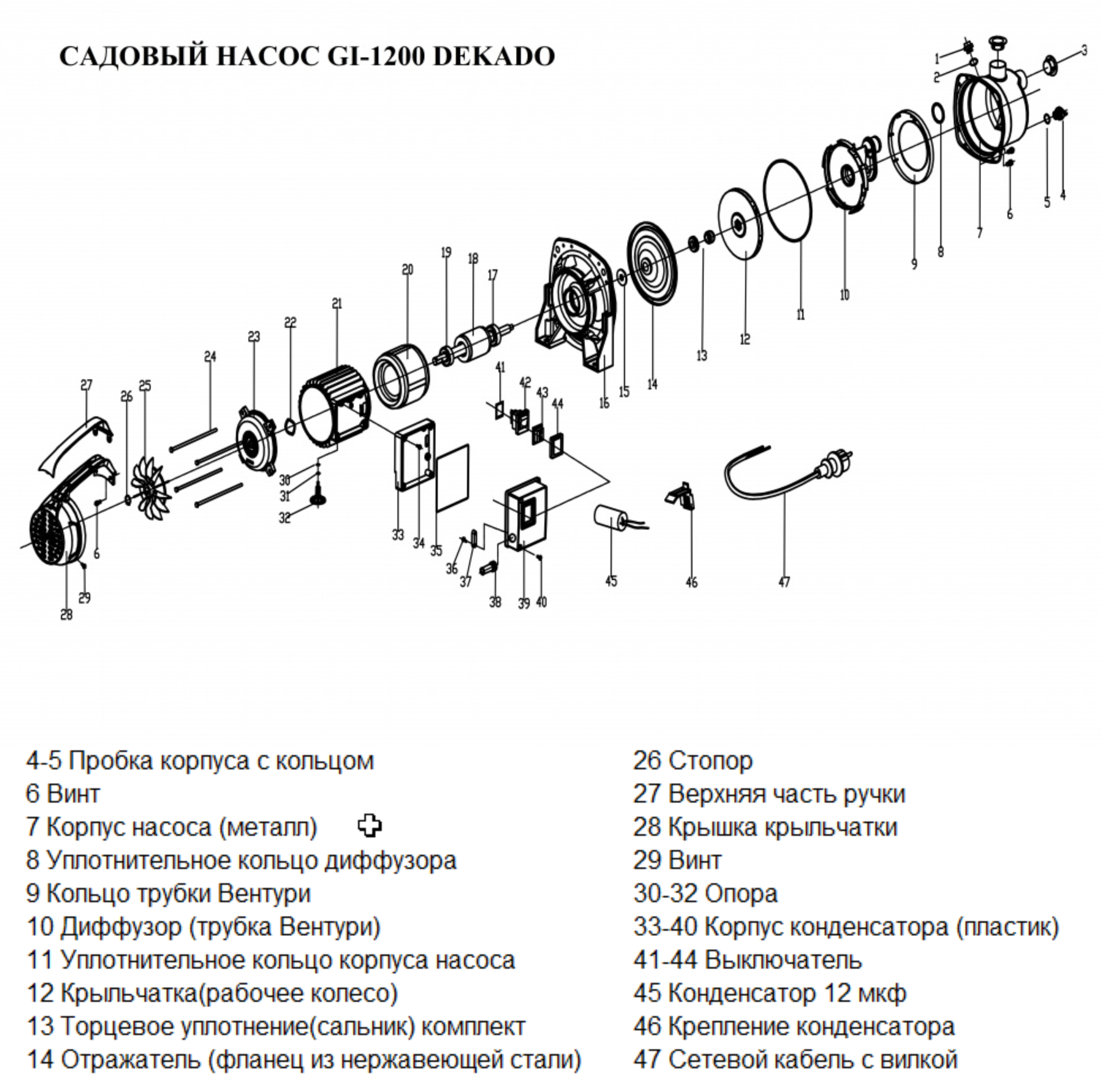 Поверхностный (садовый) насос GI-1200 DEKADO при эксплуатации не погружается в перекачиваемую жидкую среду – его располагают на поверхности земли, в непосредственной близости от источника водоснабжения. Чаще всего насосные устройства данного типа используют для работ с дождевой, пресной водопроводной, а также содержащей хлор водой из бассейна, откачивания воды из колодезных источников, так как глубина, с которой они могут эффективно откачивать жидкую среду, составляет не более 7 метров. Насос садовый GI-1200 DEKADO предназначен для осушения затопленных мест, перекачки, забора воды из колодцев и скважин, повышения давления в системах водоснабжения. Поверхностным насосом GI-1200 DEKADO можно перекачивать только воду не имеющую механических примесей. Насос предназначен только для бытового использования.